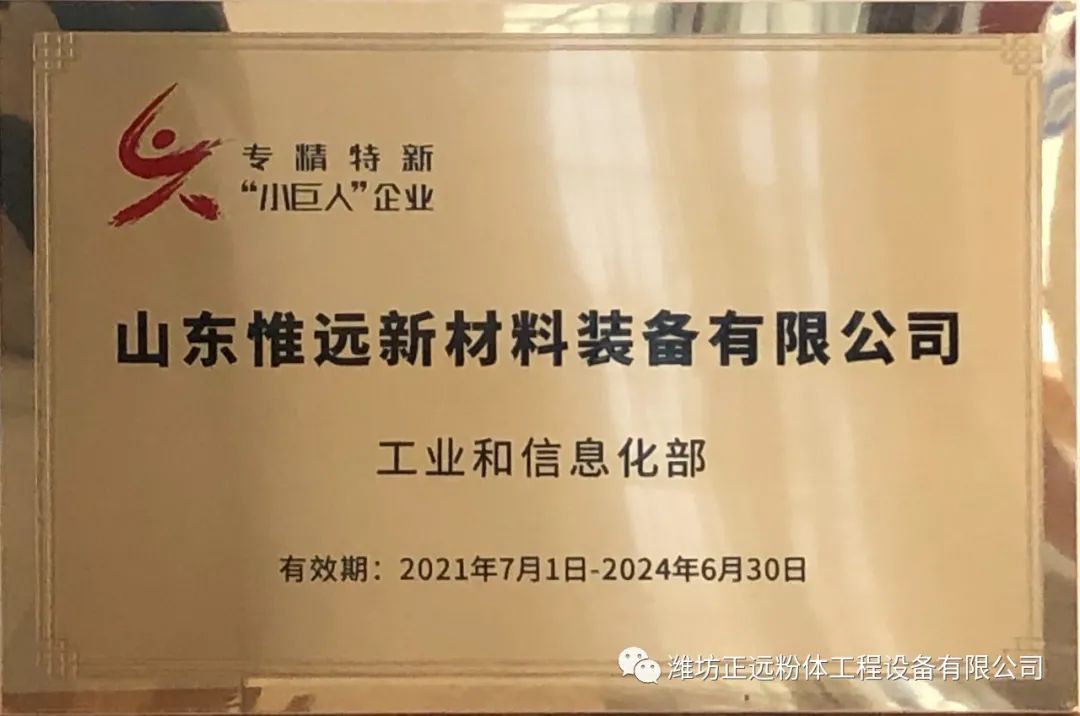 今年,正远公司的子公司山东惟远新材料装备有限公司荣获国家级《专精特新“小巨人”》企业称号,这是一份国家级的荣誉。它标志着企业的综合实力达到国内领先水平,在行业细分领域中具有突出的技术优势,同时体现了政府、行业及客户对公司产品、技术和服务的高度认可。当然,这不是正远今年唯一的荣誉,除了被评为国家级《专