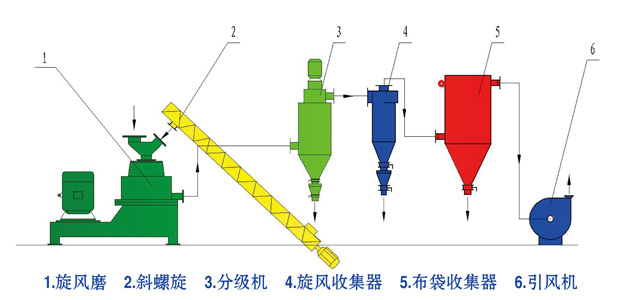 物料经变频给料机自旋风磨顶部加入装配有刀片转子的粉碎腔,旋转的刀片转子在粉碎腔内产生超高速的空气旋流,物料在空气旋流作用下进入到转子与定子的间隙内迫使颗粒之间的冲击、剪切、摩擦,造成颗粒在高应力下的裂解细化,从而实现物料粉碎。粉碎腔内部结构经科学设计,腔内的空气旋流运动导向明确,无流动死角,也保证了粉碎过程中无温升。物料粉碎细度可通过不拆机调整定子与转子之间的间隙来控制。粉碎后的物料可经负压输送装置进入收集器收集,也可经外配分级机进行精细分选、粗粒续磨作业。