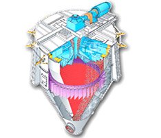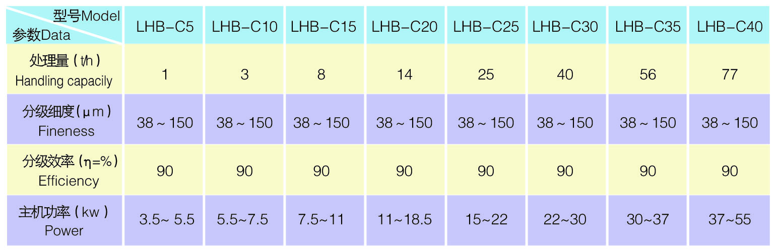 LHB-C 粗粉分级机是一种环形空气分级机。创新的分级结构由分级总成,内外筒,内外锥筒,循环风以及细度调节装置等组成。物料经进料口进入分级机内部,在甩料盘的作用下随风机产生气流上升,粗粉在重力离心力作用下,下滑至内锥筒由粗粉口排出。细粉在分级叶轮和风机叶轮的离心力作用下沿外筒内壁经细粉口排出。